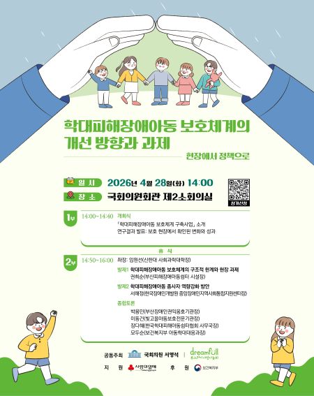 이번 포럼은 학대피해장애아동이 아동학대와 장애인학대 보호체계의 경계에 놓이며 발생하는 구조적 한계를 점검하고, 현장 실천 경험과 연구 성과를 바탕으로 향후 정책 검토에 참고할 수 있는 논의의 장을 마련하고자 기획됐다. 행사는 사회복지공동모금회 지원, 보건복지부 후원으로 진행되며 국회의원과 관계 부처, 현장 전문가, 연구자, 유관기관 관계자 등 100여 명이 참석할 예정이다.