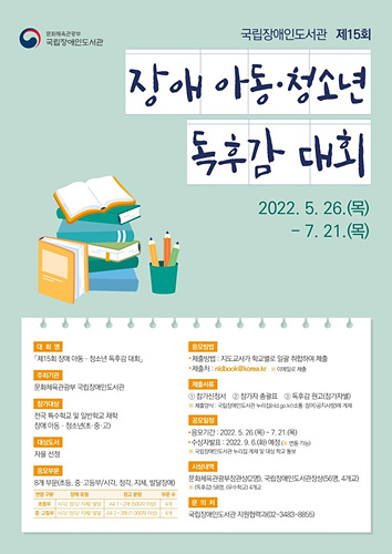 국립장애인도서관(관장 원종필)은 오는 721()까지 15회 장애 아동·청소년 독후감대회작품을 공모한다.