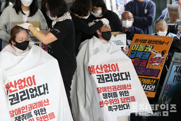 예산 인수위 답변 촉구를 위한 16차 전국장애인차별철폐연대 삭발 투쟁 결의식을 하고 있다.(사진제공=뉴시스)