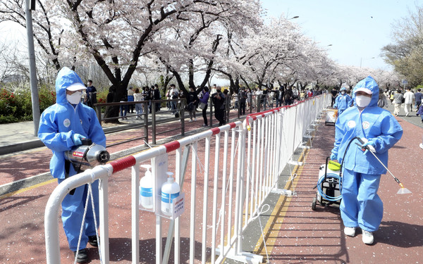 10일 서울 영등포구 여의도 윤중로 벚꽃길에서 영등포구 방역 관계자가